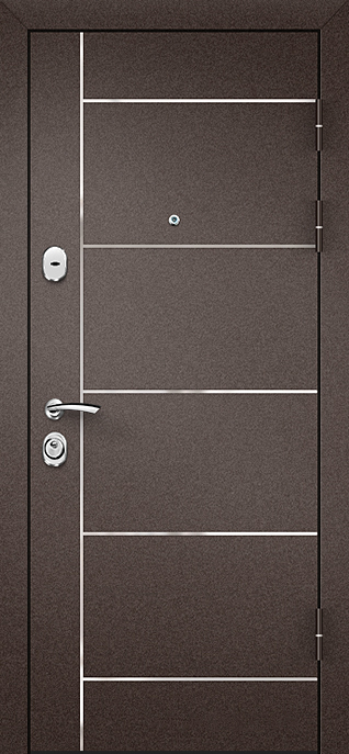 Каркас из профильной трубы и стальной лист толщиной 2 мм обеспечивают прочность конструкции и устойчивость к взлому, а два контура уплотнителей защищают помещение от сквозняков и уличного шума. Входная дверь в квартиру с зеркалом №10 выделяется сочетанием практичного молоткового напыления снаружи и аккуратной плиты МДФ внутри. Такое покрытие не боится механических повреждений и перепадов температуры, долго сохраняя первоначальный вид. Зеркало на внутренней стороне делает прихожую светлее и визуально просторнее, заменяя полноценное настенное. Дополнительные блокираторы и система ребер жёсткости усиливают надежность. Возможность изготовления в любых размерах позволяет адаптировать модель под особенности квартиры, офиса или частного дома, сохранив баланс между эстетикой и безопасностью. Входная дверь в квартиру с зеркалом №10 от производителя: быстрое изготовление и монтаж в Одинцово, индивидуальные размеры, широкий выбор материалов и фурнитуры, официальная гарантия до 10 лет.